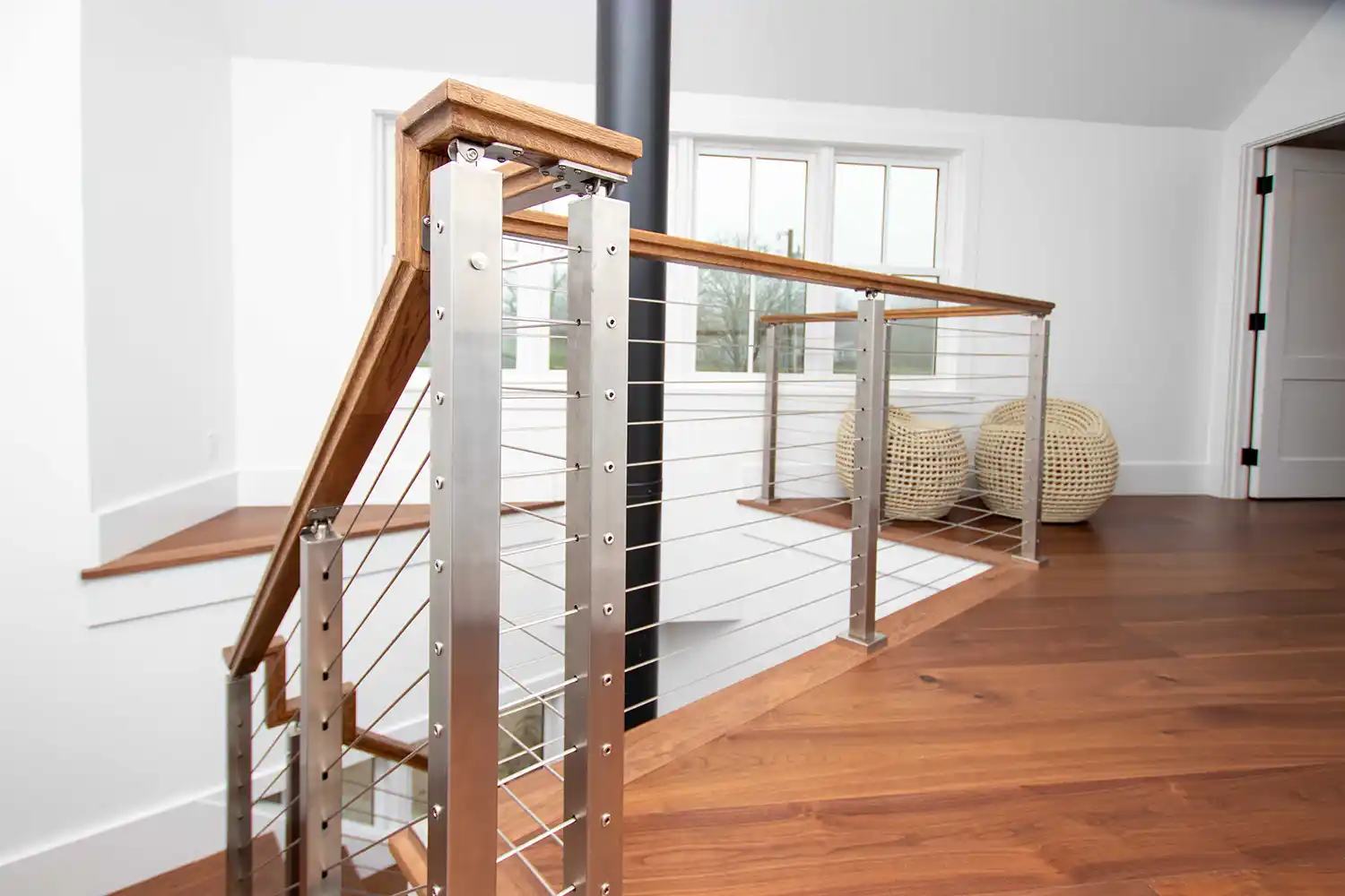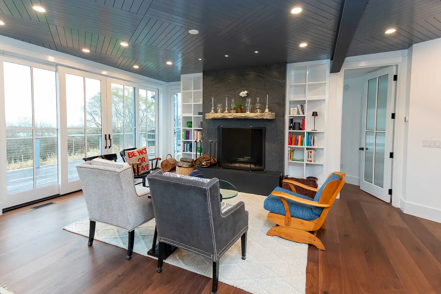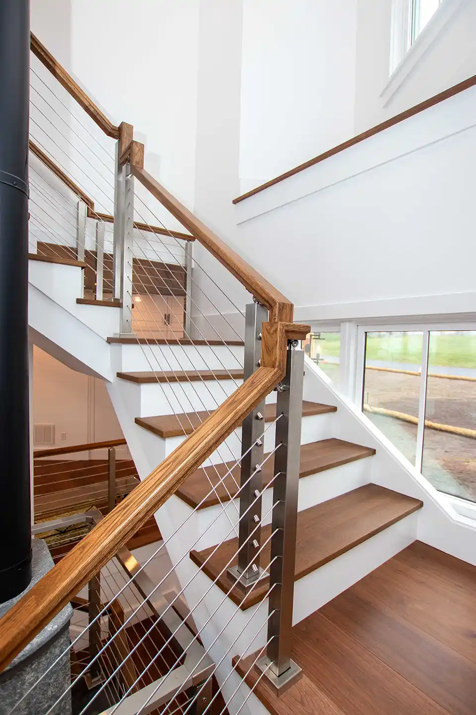 Architectural details throughout the home emphasize modern craftsmanship and intentional design. The central staircase features rich wood treads and a contemporary cable railing system. On the main landing, a stone-wrapped, cylindrical wood-burning stove provides an efficient and tactile heat source. In the living area, a dark herringbone-patterned ceiling adds sophisticated texture above a heavy stone fireplace and custom built-in shelving.