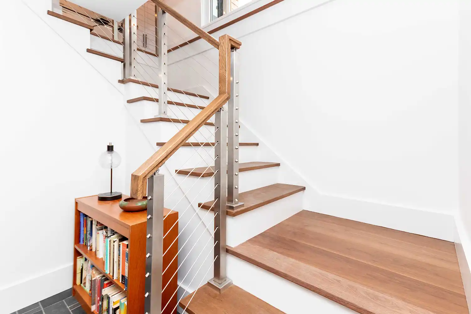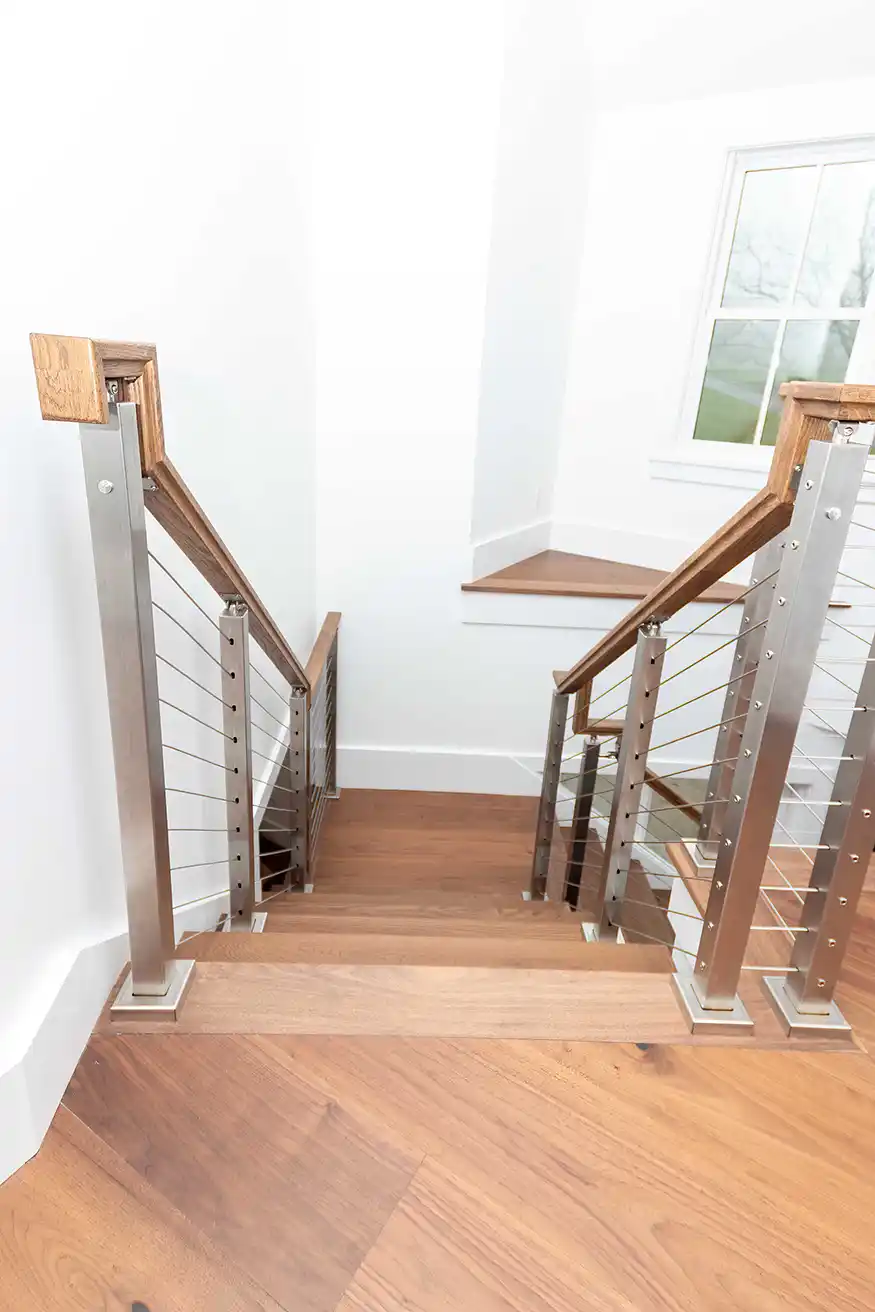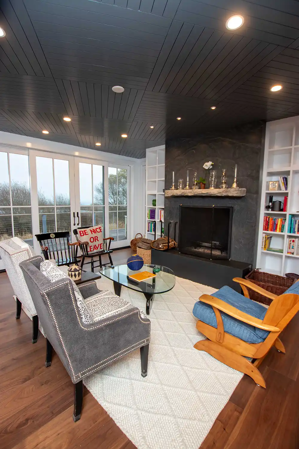 Architectural details throughout the home emphasize modern craftsmanship and intentional design. The central staircase features rich wood treads and a contemporary cable railing system. On the main landing, a stone-wrapped, cylindrical wood-burning stove provides an efficient and tactile heat source. In the living area, a dark herringbone-patterned ceiling adds sophisticated texture above a heavy stone fireplace and custom built-in shelving.