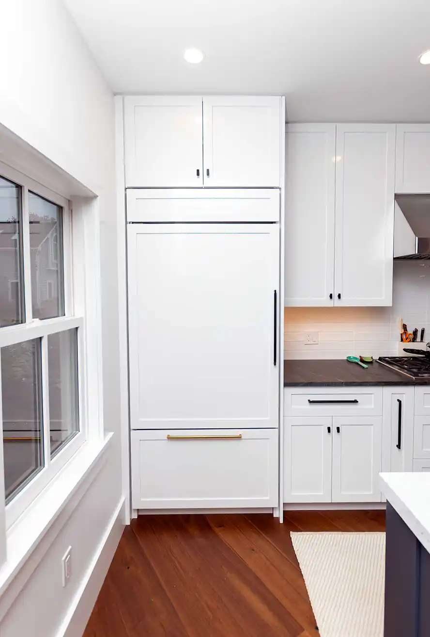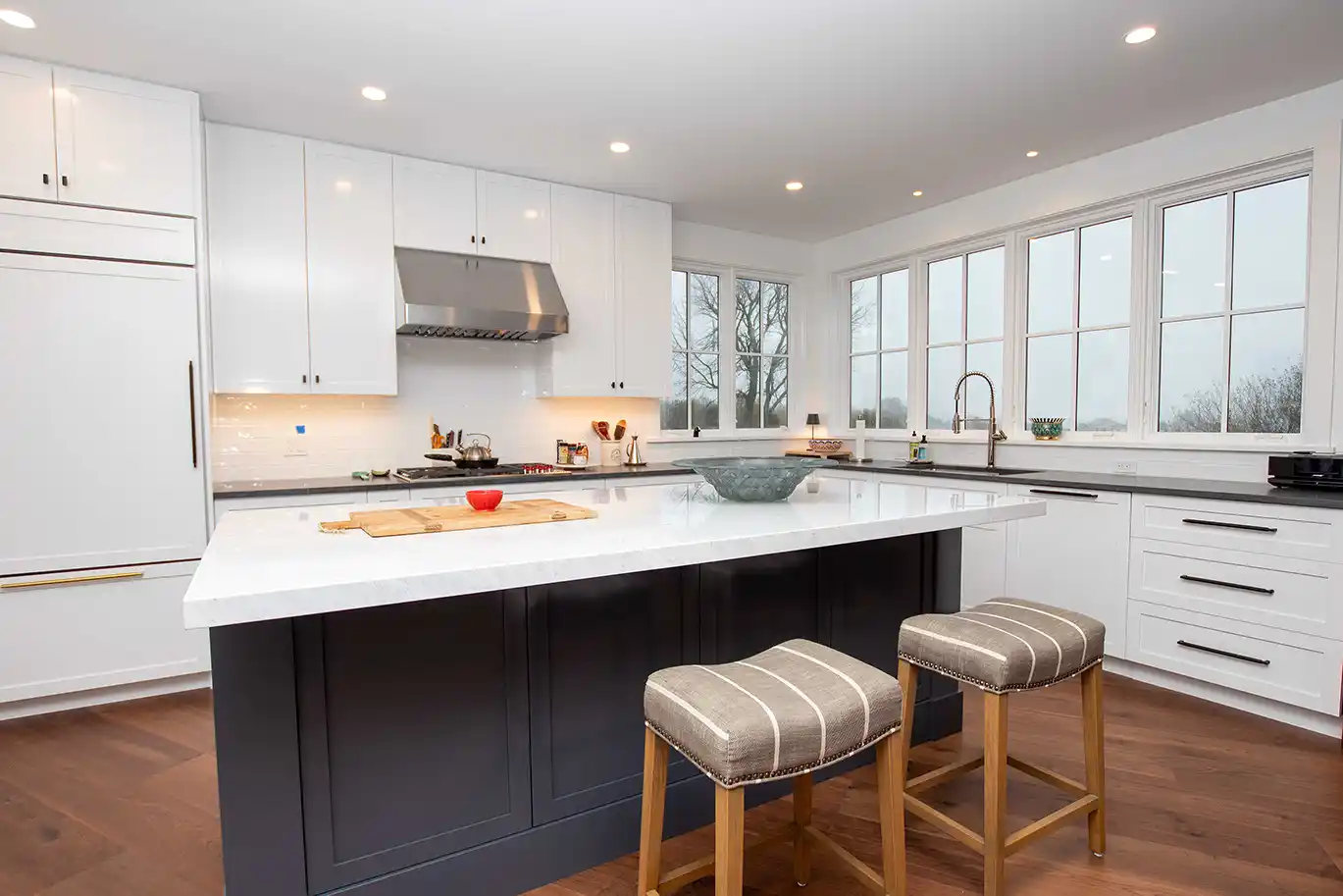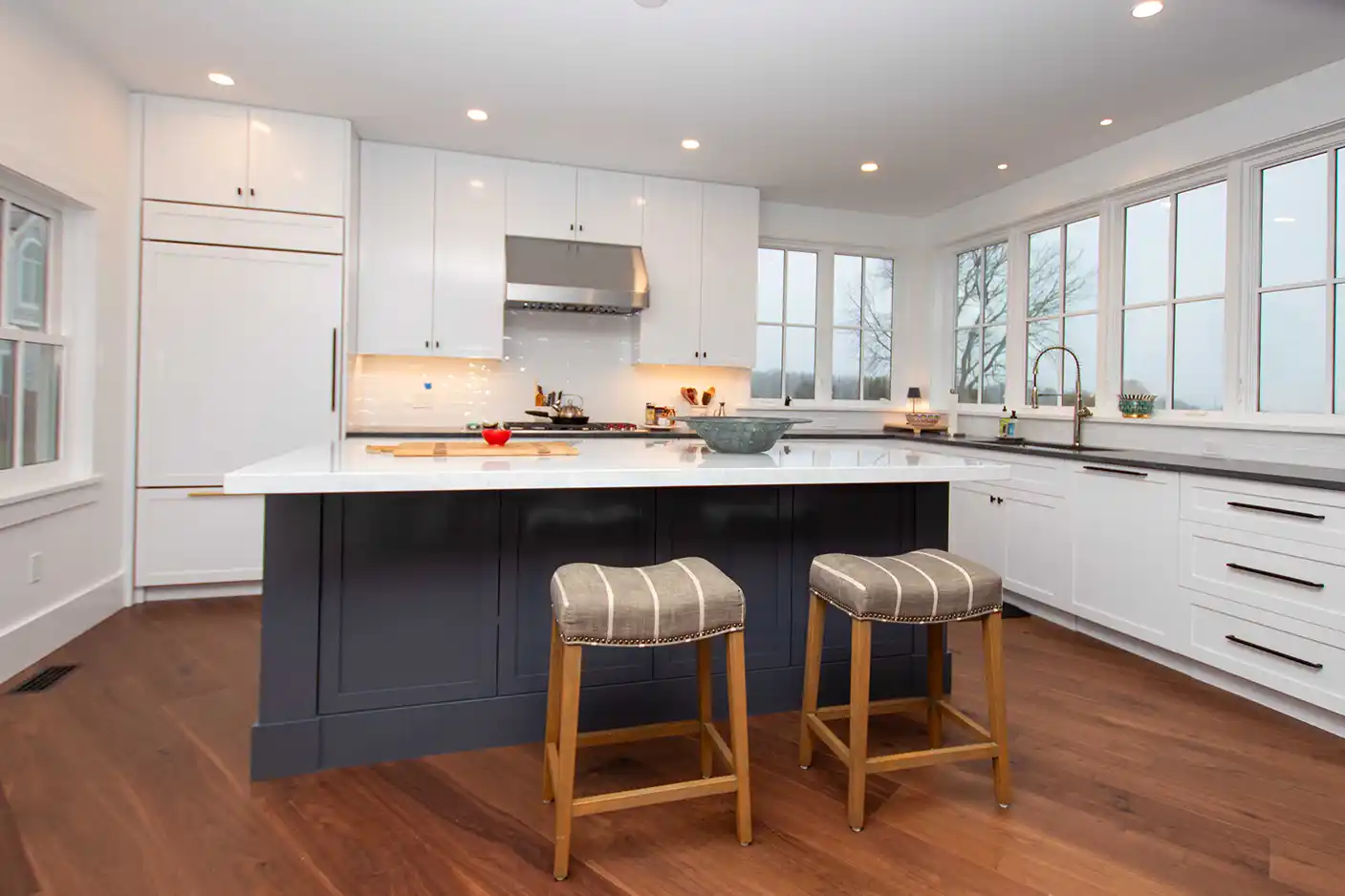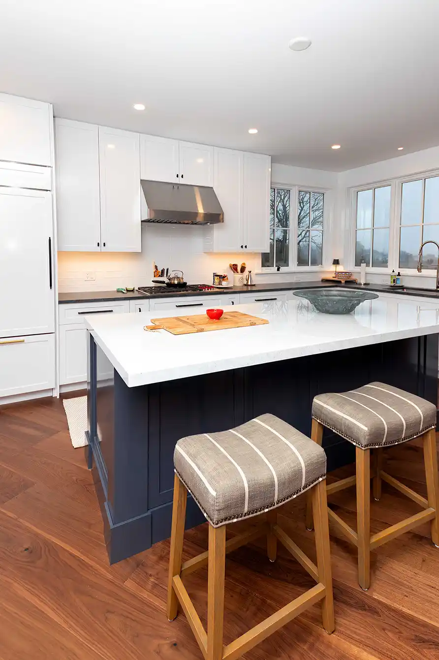 The kitchen serves as a bright, central gathering point, balancing crisp white shaker cabinetry with a substantial navy blue island. Wide-plank walnut flooring provides a warm, organic contrast to the white countertops and stainless steel professional appliances. Large windows line the perimeter, allowing the natural light of the Rhode Island coast to fill the workspace.